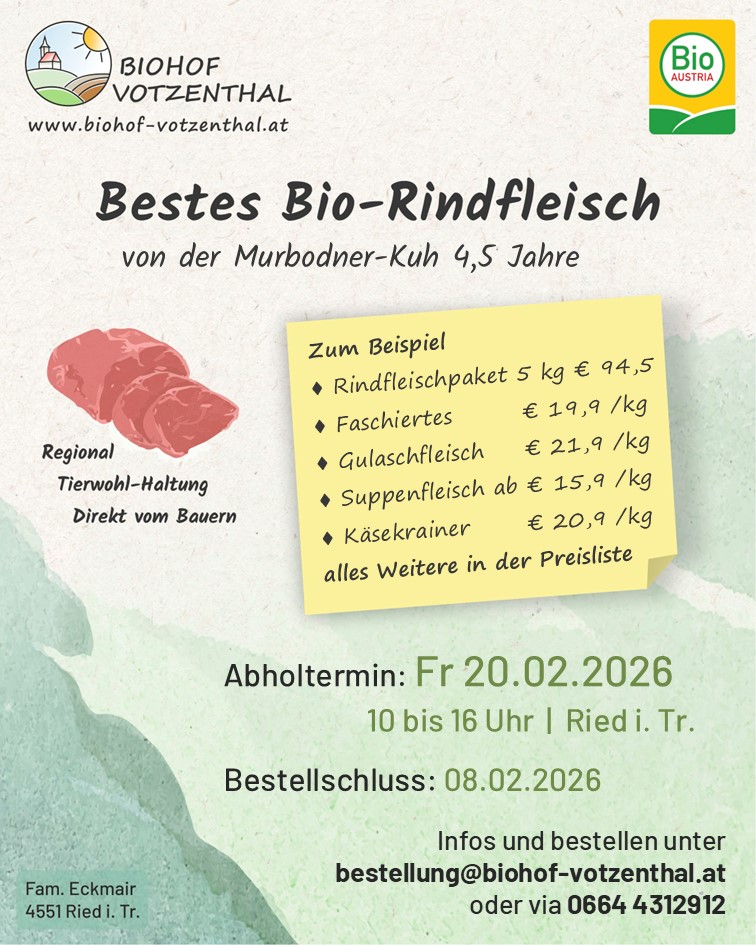 Wer einen Blick auf unsere ausführliche Preisliste werfen möchte, bitte telefonisch (+43 664 4312912) oder via Mail (office@biohof-votzenthal.at) anfordern.